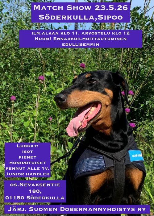 Näyttelytoimikunta järjestää Match Shown 23.5.2026 Sipoossa, osoitteessa Nevaksentie 180, 01150 Söderkulla.